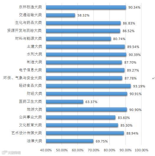 2015年专科毕业生中,轻纺食品大类毕业生到基层就业的人数占该专业大类人数的比例最大,为93.19%;其次是财经大类,为90.91%。交通运输大类毕业生到基层就业的人数占该专业大类人数的比例最小,为58.32%;其次是医药卫生大类,为63.37%。