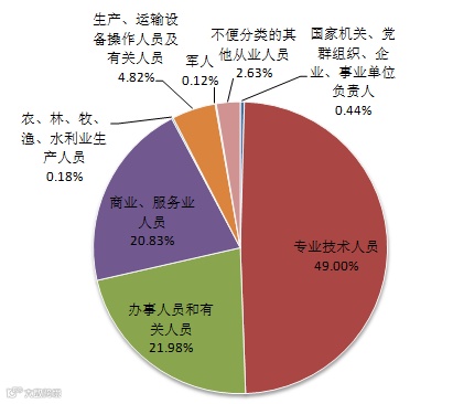 从就业职业类型大类看,广东省2015年毕业生从事最多的职业类型是专业技术人员,占已就业毕业生数的49.00%,比2014年减少0.12个百分点;其次是办事人员和有关人员,占已就业毕业生数的21.98%,比2014年增加0.25个百分点。