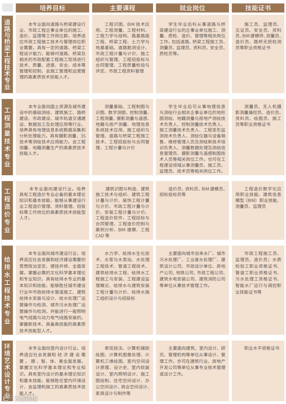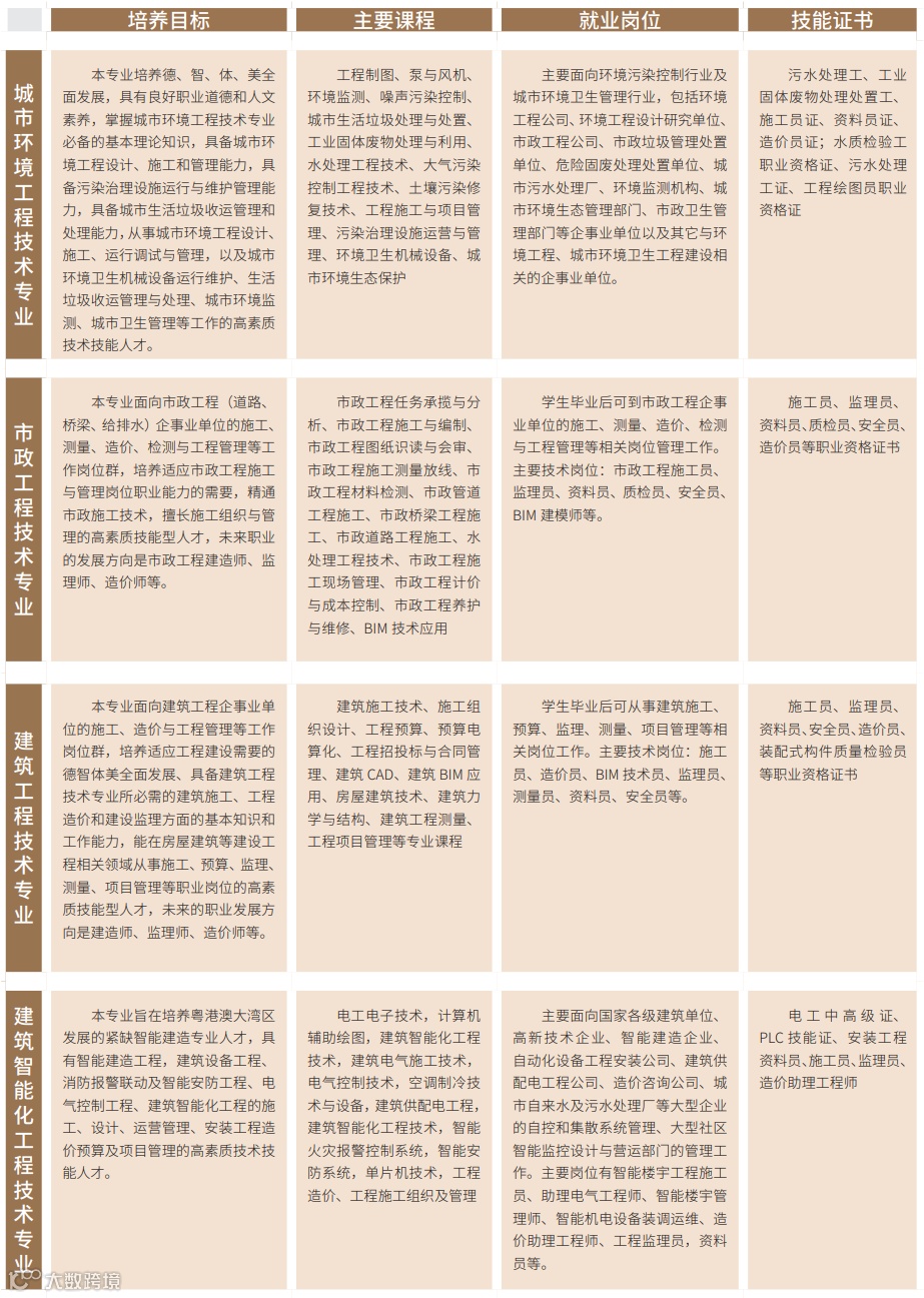 学院对接粤港澳大湾区城市基础设施建设产业链,构建大市政专业集群,培养社会紧缺的城市基础设施建设与管理专门人才。现设道路与桥梁工程技术、工程测量技术、工程造价、给排水工程技术、城市环境工程技术、建筑智能化工程技术、环境艺术设计、建筑工程技术、市政工程技术共9个专业。其中道路与桥梁工程技术专业群(含道路与桥梁工程技术、工程测量技术、工程造价、给排水工程技术等4个专业)为广东省第二批高水平专业群。工程造价、给排水工程技术、道路与桥梁工程技术、环境艺术设计等专业为广州市高职高专示范专业。给排水工程技术专业成功申报为广东石油化工学院2022年"3+2"高职本科协同育人试点专业。