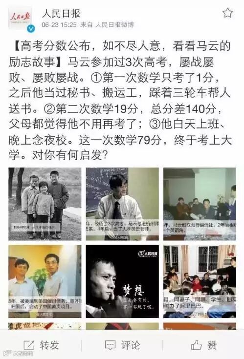 6月23日晚,阿里巴巴创始人、董事局主席马云回想起自己高考又一次失利的那个夜晚,百感交集,他给失意考生写了一封信: