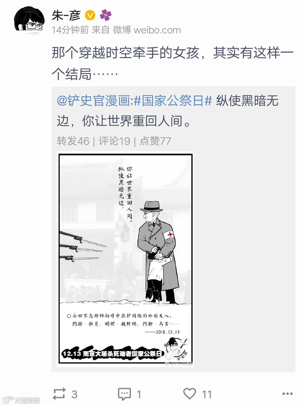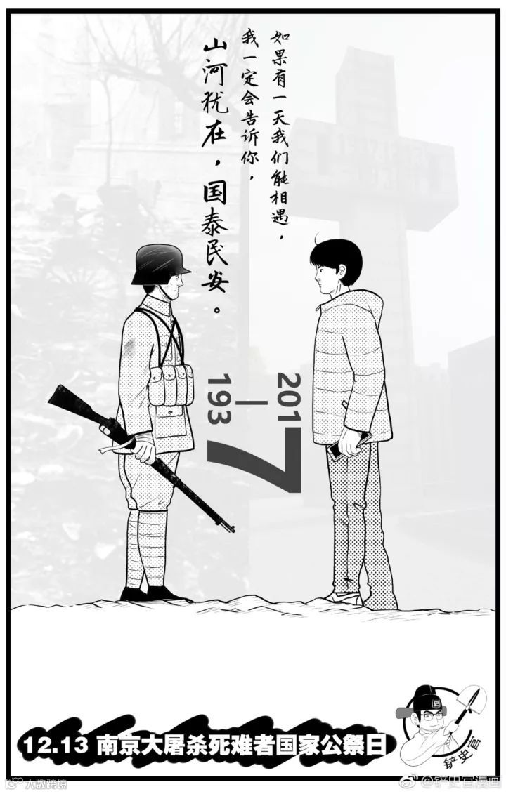 在去年公祭日当天,这张催泪的漫画以极快的速度在所有网络平台传播开来,人们既感动又心酸,写下“勿忘国耻,珍惜和平”等留言,纷纷转发。