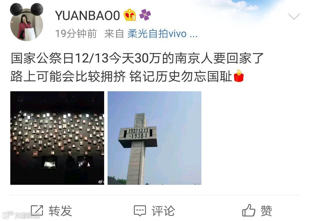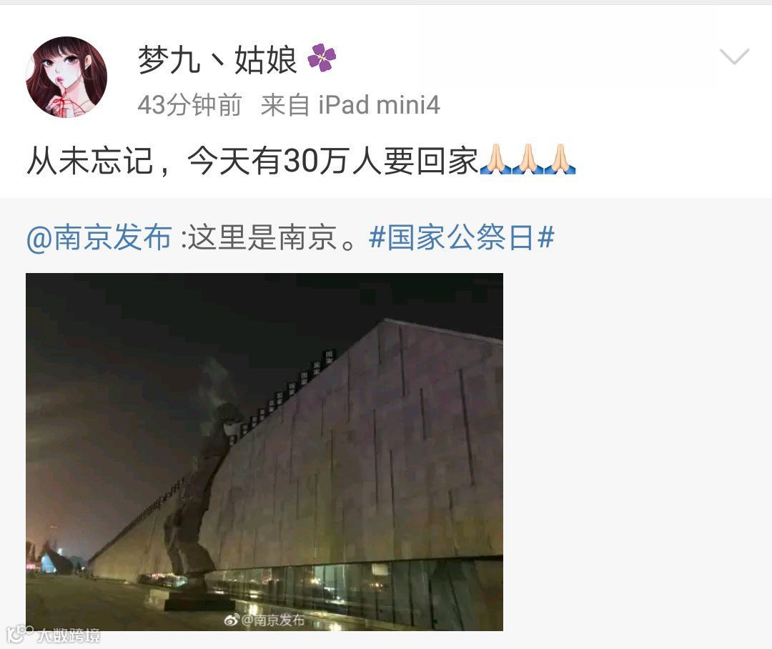 @落英凝绿99:身处南京,感谢您。每年一张,特别感谢。昨天晚上,孩子就提醒,今天公祭日,要穿深色衣服,不要太鲜艳。去年和前年的图,给孩子说了很多,他一直记得两个小姑娘隔空对话的那张。今年这张,晚上也会回家给孩子看看,也让孩子铭记历史。感谢。