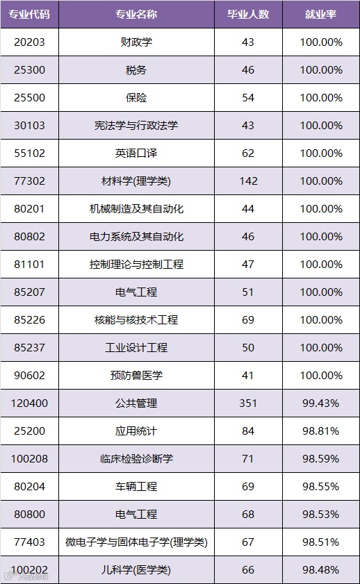 在人数最多的前20个专业中,就业率最高的是公共管理,为99.43%,其次是临床医学,为98.03%;最低的是汉语国际教育,为83.50%,其次是新闻与传播,为88.53%。人数较多的专业中,比全省研究生平均就业率低的还有外科学(108109)、工商管理、生物化学与分子生物学和会计学。