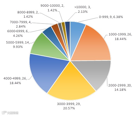 从各院校毕业生规模看,大于10000人的有3所,小于1000人的有9所。3000-3999人的最多,有29所,其次是1000-1999和4000-4999人区间,均有26所。