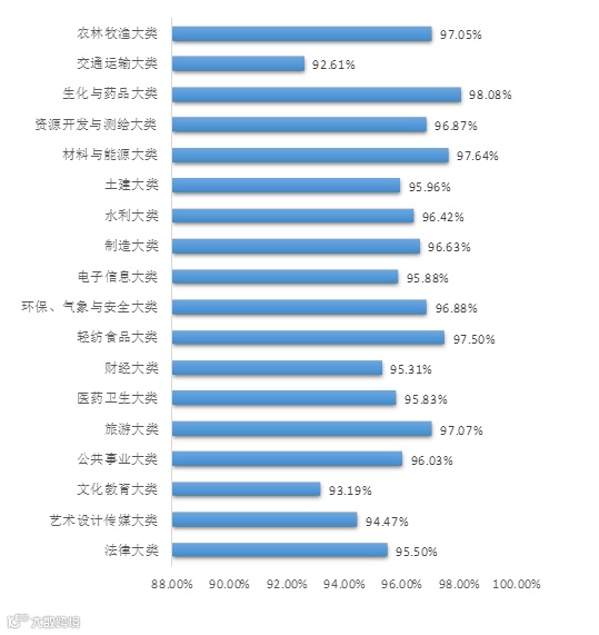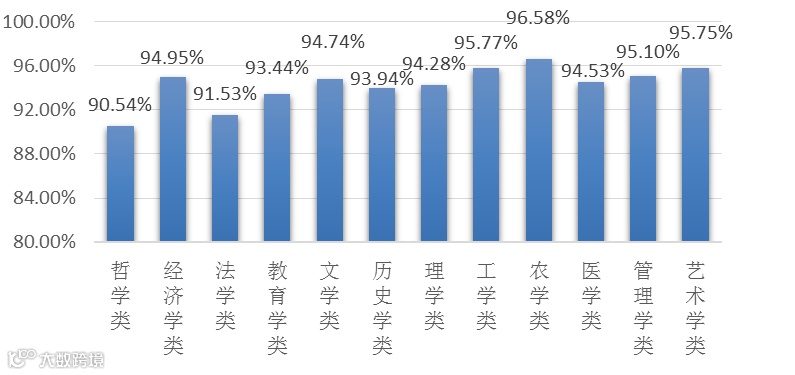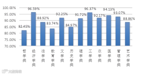 本科毕业生初次就业率为94.99%,比2016年增加了0.19个百分点。从学科就业率看,高于本科平均初次就业率的学科有农学类、工学类、艺术学类和管理学类4个学科。其中农学类毕业生就业率最高,为96.58%;其次是工学类,就业率为95.77%;第三是艺术学类,就业率为95.75%。哲学类毕业生就业率最低,为90.54%;其次是法学类,就业率为91.53%;第三是教育学类,就业率为93.44%。