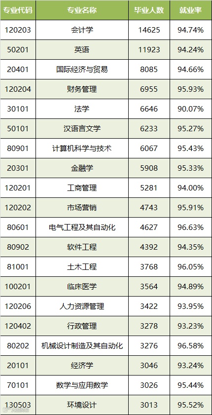 在人数最多的前20个专业中,就业率最高的是电气工程及其自动化,为96.63%,其次是机械设计制造及其自动化,为96.58%;最低的是法学,为90.07%,其次是行政管理,为93.23%。人数较多的专业中,比全省本科生平均就业率高的专业有财务管理(95.93%)、汉语言文学(95.27%)、计算机科学与技术(95.43%)等等;而会计学(94.74%)、英语(94.24%)、国际经济与贸易(94.66%)等专业则低于本科生平均水平。