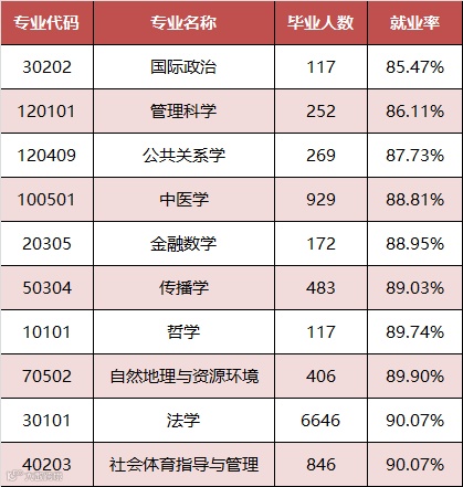 就业率相对较低的专业有国际政治(85.47%)、管理科学(86.11%)、公共关系学(87.73%)等。