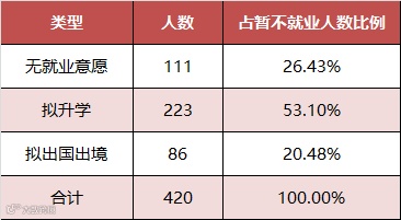 暂不就业人数为420人,暂不就业率为0.08%。其中111人无就业意愿,占暂不就业人数的26.43%,223人拟升学,占53.10%,86人拟出国出境,占20.48%。