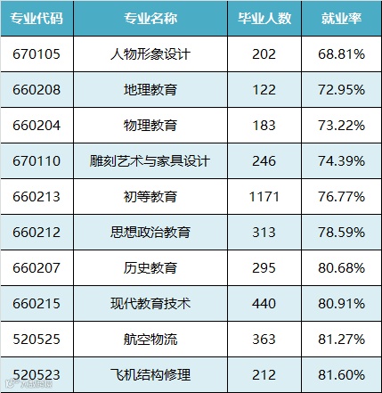 就业率最低的10个专业中,有6个专业属文化教育大类。最低的是人物形象设计,为68.81%;其次是地理教育,为72.95%;第三是物理教育,为73.22%。