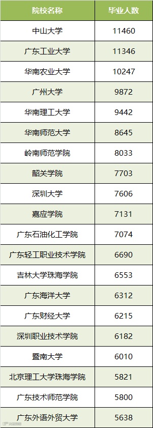 毕业生人数最多的是中山大学,有11460人,其次是广东工业大学,有11346人,第三是华南农业大学,有10247人。