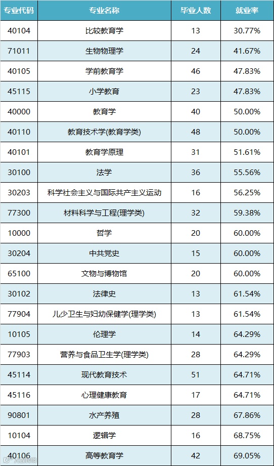 就业率低于70%的专业(毕业生人数在10以上)有22个,属教育学类最多,有9个。就业率最低的是比较教育学,为30.77%,其次是生物物理学,为41.67%。