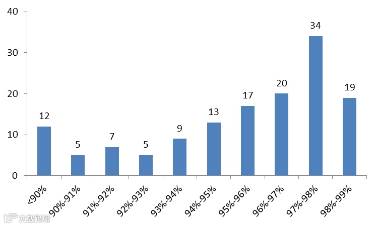 从院校初次就业率分布区间看,广东省141所普通高校(因8所研究生培养单位人数较少,不纳入此处统计)中,初次就业率在97%(含)至98%区间最多,有34所;其次是96%(含)至97%区间,有20所。就业率在98%(含)-99%区间的院校19所。没有院校就业率高于99%,有12所院校就业率不足90%。