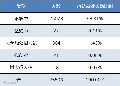 2017年我省高校毕业生有就业意愿尚未就业人数为25508人,待就业率为4.83%。其中“求职中”人数最多,有25078人,占待就业人数的98.31%,其次是“拟参加公招考试”,有364人,占1.43%。