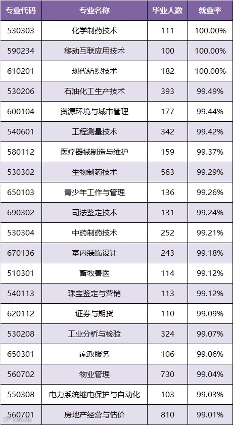 从国家设置的标准专业(毕业生人数在100以上)看,就业率为100%的有3个。就业率最高前20名专业中,属生化与药品大类的最多,有5个。