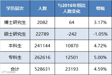 广东省2017届实际参加就业的普通高校毕业生人数(指截至2017年9月1日的实际参加就业的普通高校全日制毕业生人数,不含因休学、结业、肄业等未取得毕业资格的毕业生及港澳台地区、外籍生源毕业生3.1万人。数据来源:广东省高校毕业生就业管理系统,如无特殊说明,本报告数据均来源于此系统)为528631人,比2016年增加了23193人,增幅为4.59%,增幅比2016年增加2.16个百分点。
