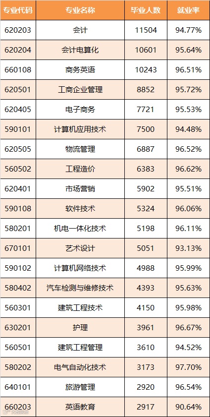 在人数最多的前20个专业中,就业率最高的是电气自动化技术,为97.70%,其次是护理,为96.67%;最低的是英语教育,为90.64%,其次是艺术设计,为93.13%。人数较多的专业中,比全省专科生平均就业率高的专业有会计电算化(95.64%)、商务英语(96.51%)、工商企业管理(95.72%)等等;而会计(94.77%)、计算机应用技术(94.48%)等专业则低于专科生平均水平。