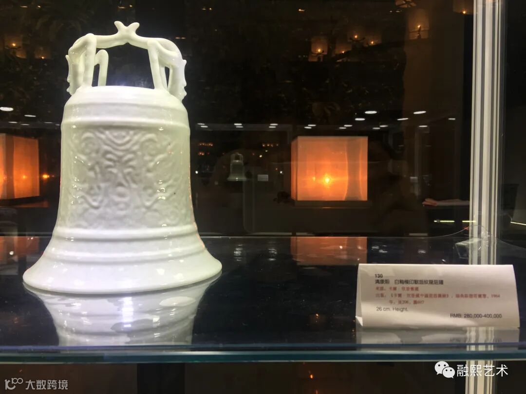 嘉靖印款白釉模印兽面纹交龙钮瓷钟在预展现场