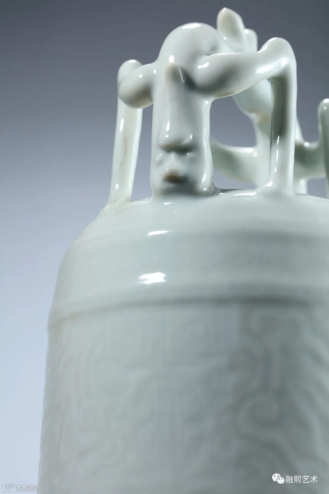 这只白釉模印兽面纹交龙钮瓷钟虽硕大,却无笨重之感。由于钟顶以交龙作挂钩,反而显得别出新意,刚劲有力,体现出宫廷重器的气象。