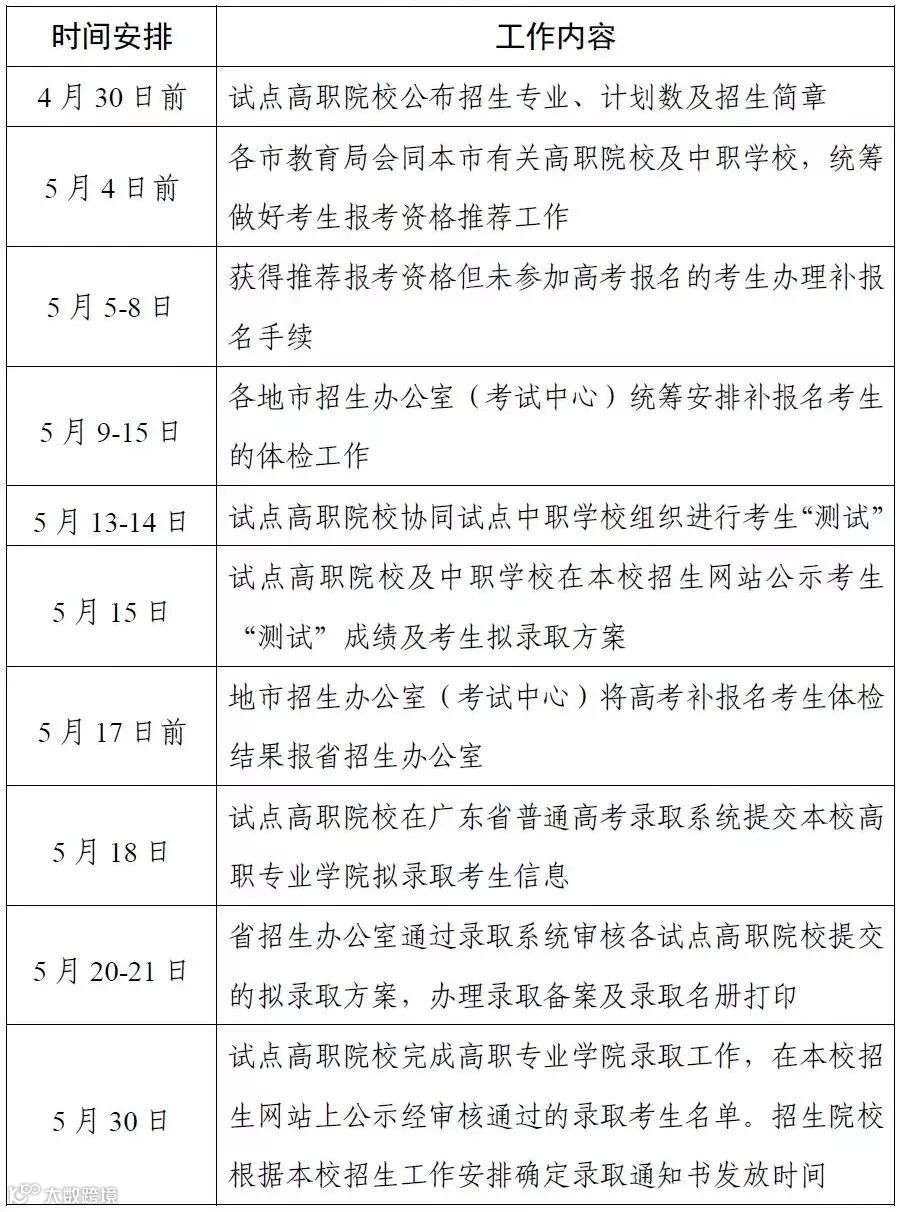 为全面贯彻全国教育大会和《国家职业教育改革实施方案》(国发〔2019〕4号)精神,深入落实《2019年国务院政府工作报告》部署和要求,着力提高广东省高等教育毛入学率,经研究,广东省教育厅决定2019年由省内部分公办高职院校会同办学水平及社会认可度较高的国家、省示范性中职学校设立“高职专业学院试点班”,开展“推荐+测试”自主招生试点工作。