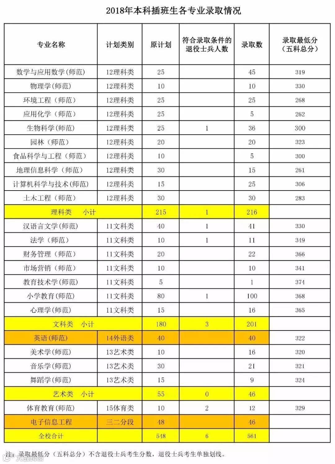在省招生办公室划定的两条录取最低分数线上,按五科总分由高分到低分择优录取考生;在原上报的总计划数548个基础上,申请增加13个计划,用于录取符合条件的退役士兵考生及已投末位同分点考生;个别专业间计划调整按省招办的指导意见执行,共录取考生561名(含6名符合录取条件的退役士兵)。退役士兵考生单独划线,服役期间荣立三等功以上奖励的退役士兵免试入读,均不占原公布的招生计划数。