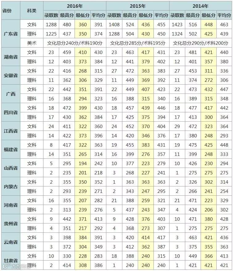 广州城市职业学院2014-2016年普高专科全国分省(区)录取分数一览表