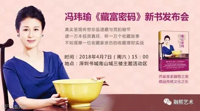 4月7日下午3点,深圳书城南山城举办的冯玮瑜《藏富密码》新书发布会,是该书上市后的第一场地面活动,也是广大读者与珍稀藏品亲密接触的绝佳机会。届时,作者冯玮瑜女士将带着她的新书和她珍藏的部分黄釉瓷器亲临现场,到场读者将有福亲眼见证这一盛事。