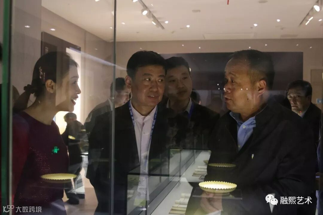 “黄承天德明清御窑黄釉瓷器珍品展”展览现场:景德镇市人民政府副市长熊皓(右一)景德镇市考古所所长江建新(中间)与冯玮瑜(左一)