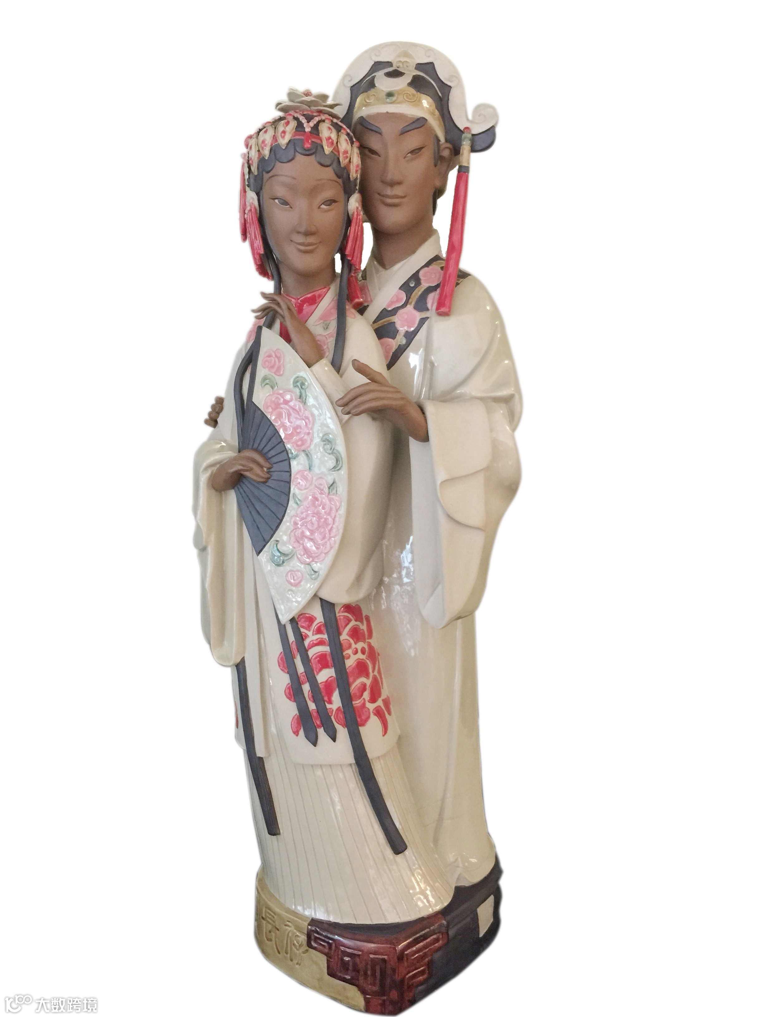 作者借著名戏剧《牡丹亭》的主人翁历经困难、生死,终成眷属的浪漫爱情故事鼓舞人们对美好爱情的追求。作品衣抉飘飘,淡雅的红、白釉色相互交映,更有一双妙人相依,眉目间浓情蜜意。