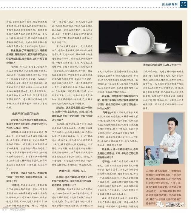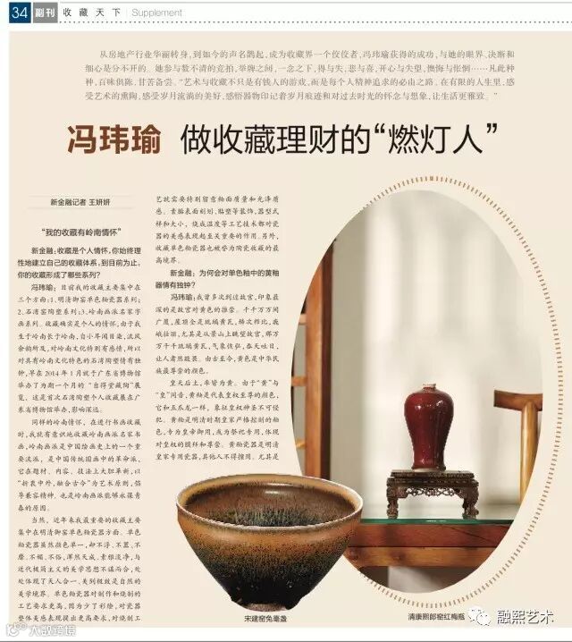 冯玮瑜: 股市是银,房产是金,藏品就是藏在你家里的钻石。认识到收藏除了艺术属性,也具有金融属性后,人们就知道,艺术品收藏要真、精、尖,而“精品意识、品相完美、流传有序”的原则是不二法门。投资有风险,收藏要谨慎。宁可错过,不可买错。我是从房地产行业转到收藏理财领域的,我在房地产业见过和亲身经历过许多事,所以我从不捡漏,从不贪便宜,尽可能用比市场价高一些的价格选择精品,因此规避了收藏的风险。