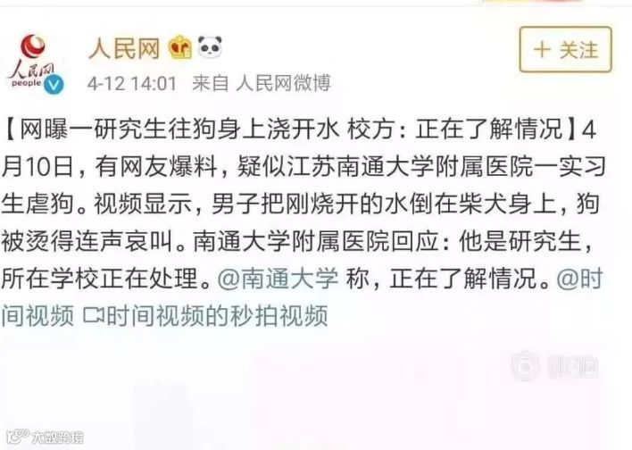 而之前在南通大学的研究生陈某也是一样做出丧心病狂的举动,拿着开水猛的浇到了一只流浪狗的身上,而陈某本身就是学医,所谓医者父母心,这应该是一件非常讽刺的事情吧,然而学校的态度也是打着太极一般,极其不负责任。
