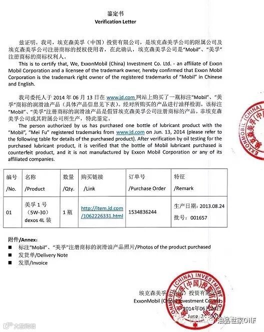 埃克森美孚公司委托其他人于2014年6月13日在京东商城网站上购买了一瓶第三方销售的“美孚1号”产品(见京东商城发票及快递清单)。经对所购买的美孚产品进行油样检测,该“美孚1号”产品是假冒产品,非埃克森美孚公司及其附属公司所生产。埃克森美孚公司从来没有授权任何电商销售美孚产品,也不支持经销商在网站上销售美孚产品。