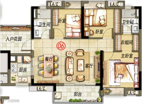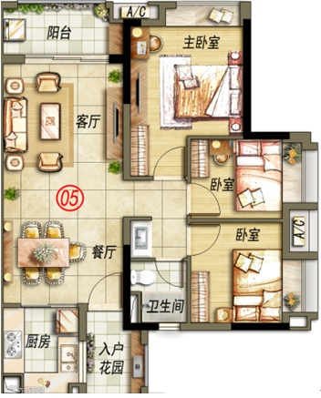 95方三房两厅两卫: 亲水户型,毗邻山水,聚财旺丁,视野通达;方正三房,南北通透,享受尊贵空间;偌大入户花园,满足空中花园的需求;独特套房设计,灵动飘窗,空间感足。