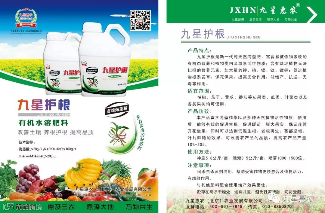 九星护根是新一代纯天然海藻肥,富含易被作物吸收的有机态营养和植物类内源激素活性物质;含有陆地植物无法比拟的营养元素,如大量的钾、碘、镁、钛、锰等;促进植物根系发育,保花保果,提高光合作用,能增产、抗逆、无