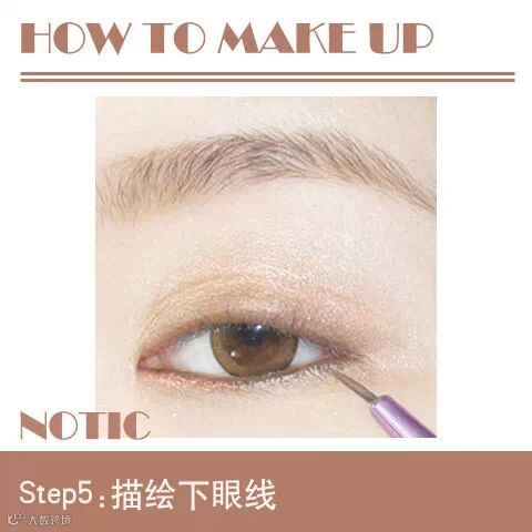 5、用眼线刷蘸取一层薄薄的黑色眼线膏,沿着眼尾到眼头的方向,在下眼睑的眼尾1/3处画上下眼线。需要注意的一点是从眼尾至眼头的方向慢慢减淡眼线颜色。