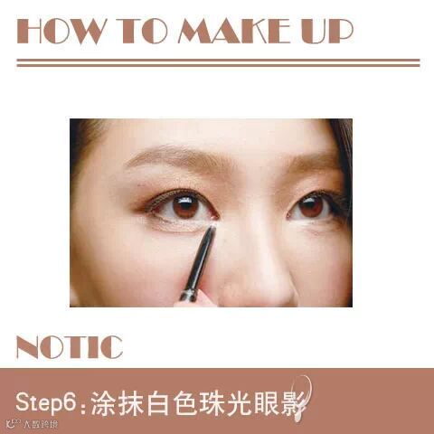 6、最后一步就是上些白色的珠光眼影,轻轻打在眼头上,可以起到放大眼镜的作用,让眼妆更加水灵更加美丽。