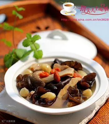 11、加入白果和黑木耳,再加盖转低温键炖煮半个小时; 12、最后加入白胡椒和盐调味, 加入几颗枸杞;