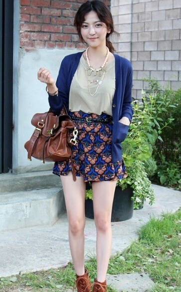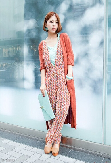 女孩身上这条彩色波浪纹的连体裤,真的好美啊,但是想想如果她的长开衫和内搭背心都选用了别的颜色恐怕就没有现在的感官效果那么好了吧,而且女孩还细心到连耳环手环和手包都用了相互呼应的色彩,更是让整身搭配多了些时尚感!