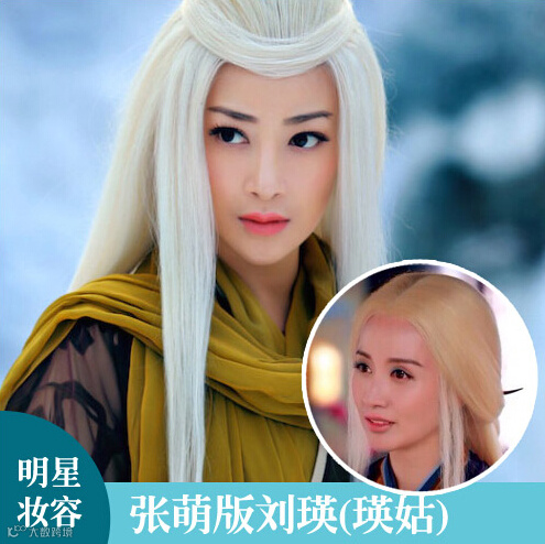瑛姑的妆容在颜色上比较丰富,但是效果却不咋样。炭黑眉毛搭配橘粉色的唇膏,颜色上本来没什么不妥,但是加上橘色的腮红和白色的长发,整个配色就有点土气了。