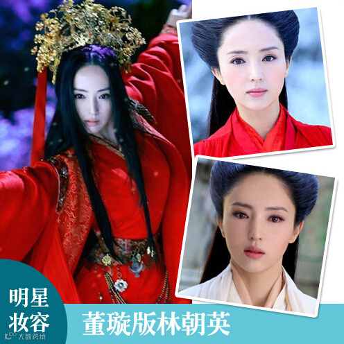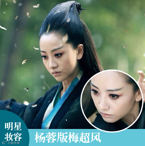 这个妆容可以算是“异类”,上扬的黑粗眉搭配上扬的红色眼影,外包的黑眼线男搭配浓密的上下假睫毛,眼妆看起来比较鬼魅。而惨白的底妆搭配惨白的唇色,最直接的展现梅超风女魔头的形象。