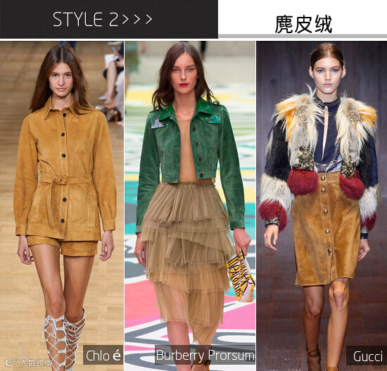 趋势解读:嬉皮风盛行的70年代大肆席卷了2015春夏T台,除了复古的代表阔腿裤以外,绒面的麂皮材质以夹克、衬衫、短裤、喇叭裤、铅笔裙的出现在GUCCI、Chloe、Burberry Prorsum等大牌的秀场上。