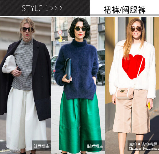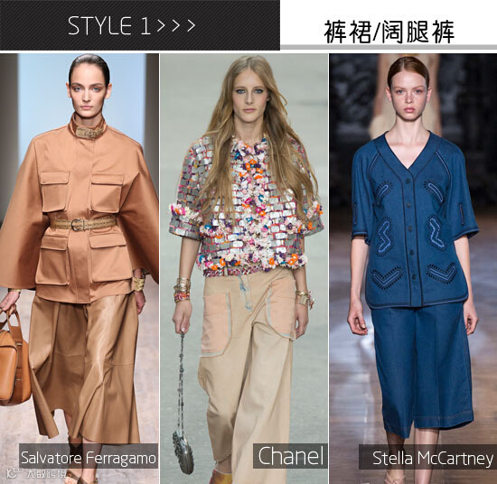 趋势解读:从传统的阔腿裤到近几季颇为流行的宽版七分裤、九分款,欧美街拍中的气场女王们越来越钟爱用“宽裤子”来打造时髦新造型。在2015年春夏大秀的秀场上,菲拉格慕、CHANEL等众多品牌都选用了有型的裤裙作为下装,比裤子潇洒,比裙子不羁的裤裙在2015年一定会成为大热的单品!