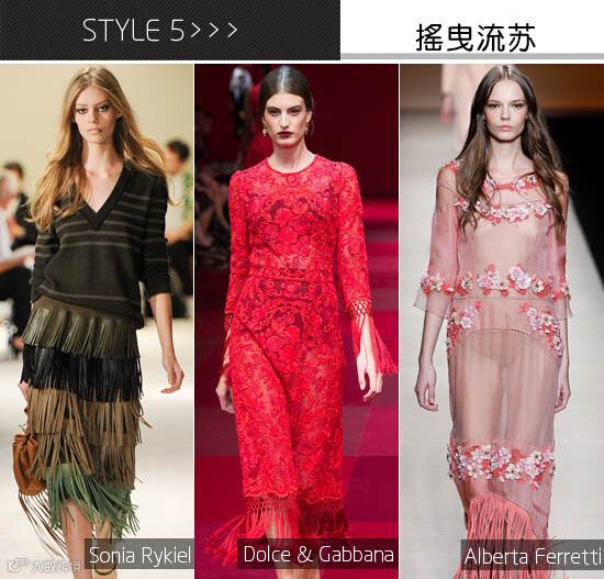 趋势解读:增添女性韵味的裙摆上点缀了摇曳的流苏,让原本就已经柔美的裙摆更添了几分妩媚,2015春夏秀场上,不管是帅气的皮裙还是仙气的蕾丝裙,添加了流苏元素后更添时髦质感。