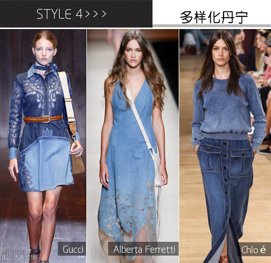 趋势解读:丹宁牛仔从未远离过时尚圈,牛仔衬衫、牛仔裤、牛仔夹克...但是在2015年春夏秀场上,丹宁牛仔这种休闲街头风格十足的布料被设计师运用得更加广泛,加入了精美华丽的镂空绣花元素就从女汉子风十足变成了仙女风格,就连以出品仙女裙著称的Alberta Ferretti也忍不住运用了丹宁牛仔。