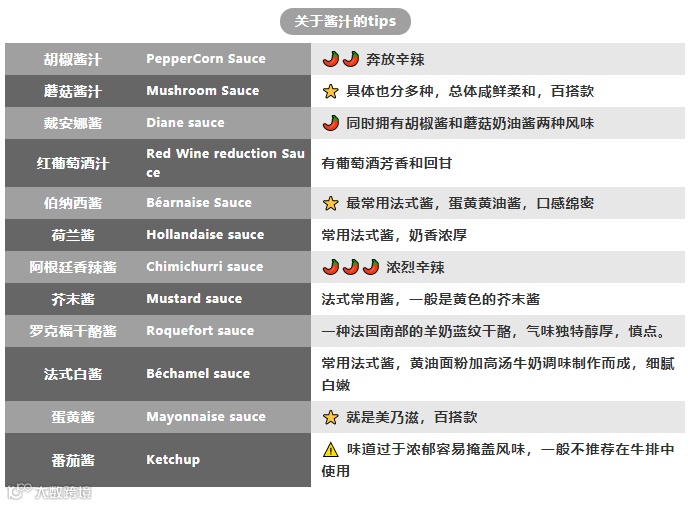 法式牛排特别注重用各式的酱汁凸显牛排的尊贵地位,最传统的是法式蛋黄香草汁,此外还有常见的胡椒汁和蒜头酱汁等。