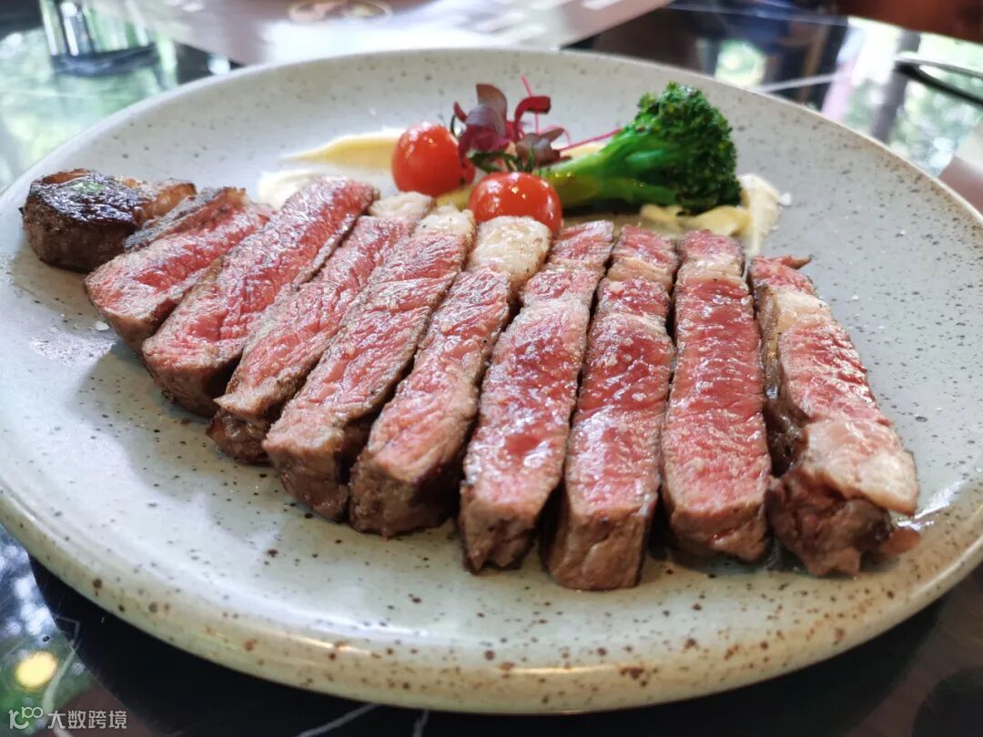 牛排的汁水在入嘴时就瞬间迸发。蘸上调料吃柔软的肉质一口就让人感叹不愧是牛排中的“黄金肉质”。