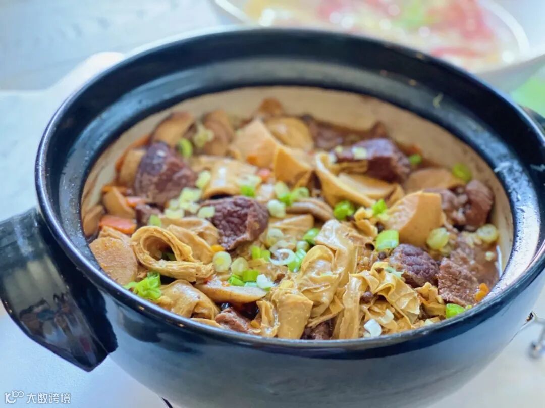 食材:腐竹150g、牛腩500g、油、盐、剁椒、青椒、红椒、生姜、豆瓣、啤酒、八角、草果各适量