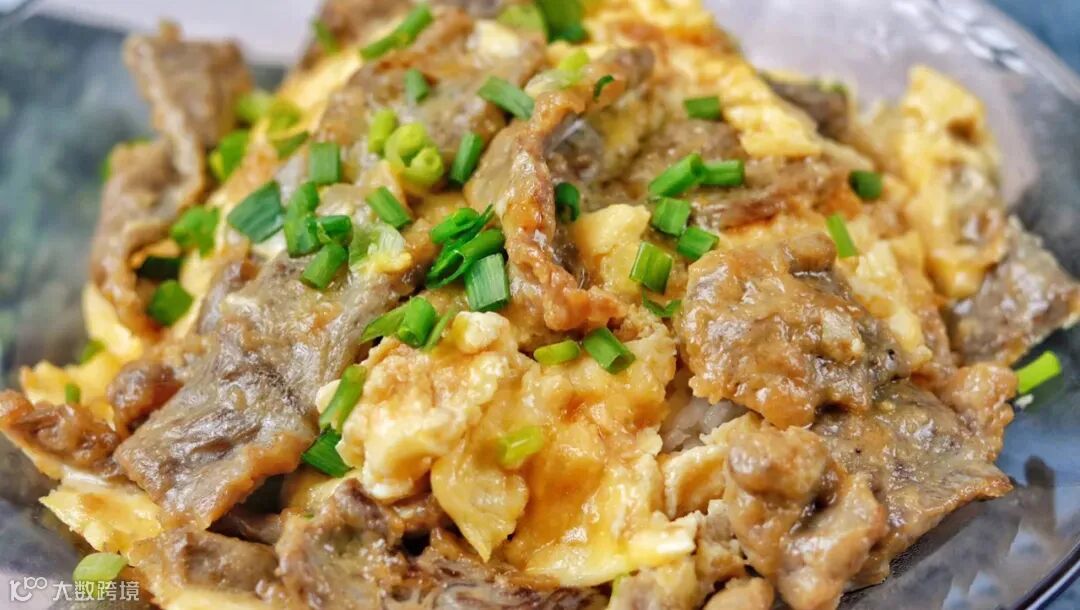 5、炒锅内留一半的油,烧热后转小火,将牛肉鸡蛋液倒进炒锅内。待蛋液稍凝固后翻动,约半分钟即可出锅。