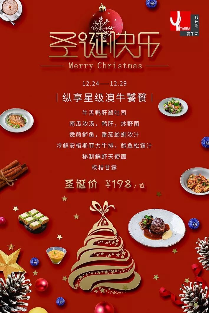 本圣诞大餐由星级主厨刘亚辉先生倾力打造,遴选「YARRA爱牛π」备受欢迎的主打菜之一『冷鲜安格斯菲力牛排,配以鲍鱼松露汁』,更特别推出新菜〖牛舌鸭肝酱吐司〗,还有数道经典菜,带你的味蕾度过一个精彩纷呈的西式圣诞。