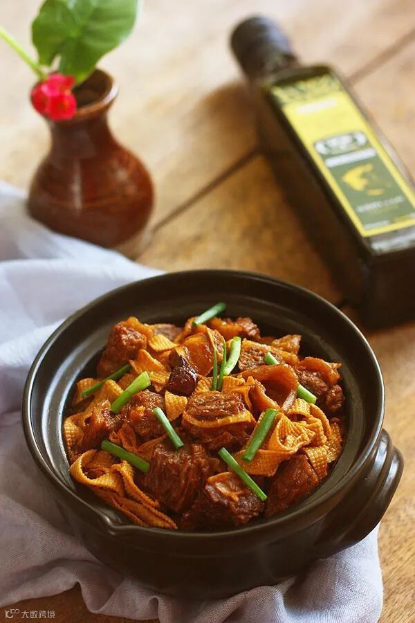 - 原料:牛腩600克,千张200克,八角5克,桂皮3克,老抽5毫升,橄榄油30毫升,姜5克,细葱10克,米酒10毫升,白糖5克,盐适量