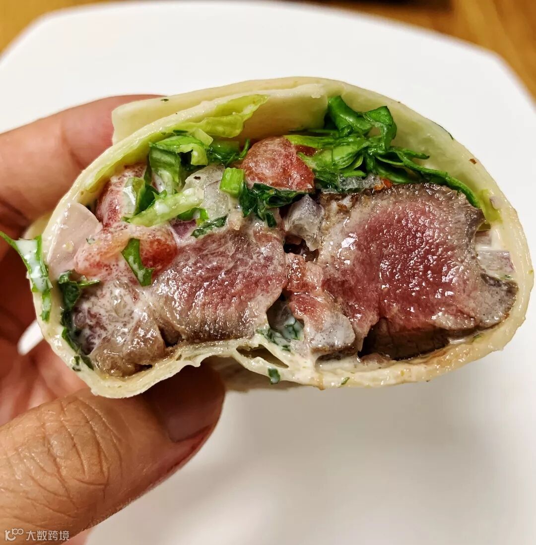 酸甜的番茄、清爽的生菜、爽口的酸奶酱,以及鲜嫩可口的牛排,玉米卷饼包起来,大口咬下去,“超清爽、超满足!”